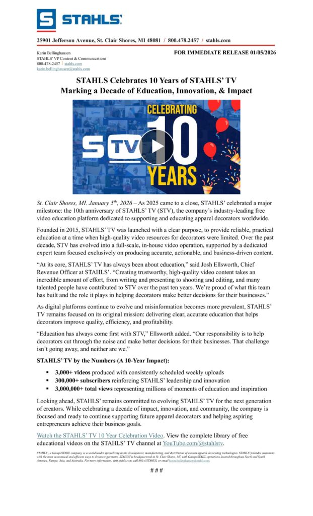 For the past decade, STAHLS’ TV has been a go-to resource for decorators looking to grow their skills, their confidence, and their businesses. What started as a way to teach the fundamentals of heat printing has evolved into a trusted YouTube channel covering the full spectrum of modern apparel decoration.