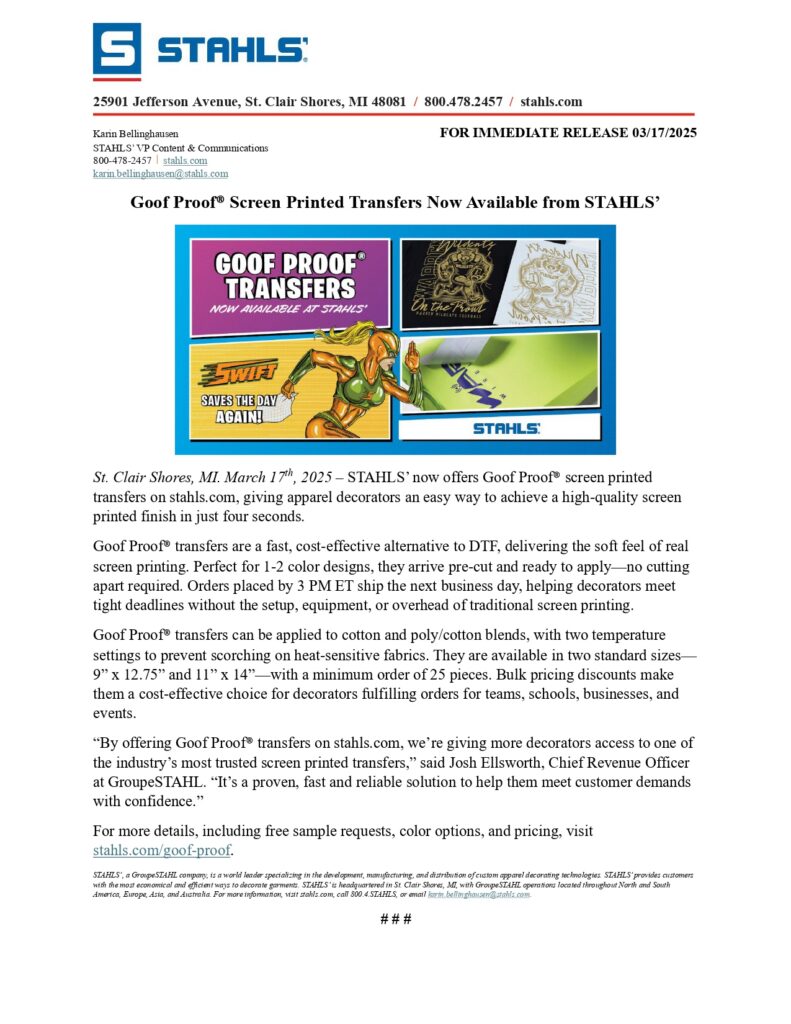 Goof Proof® Screen Printed Transfers have officially landed at STAHLS’—but how do they stack up against Inktra®? If you’re wondering which one is the best fit for your next project, you’re in the right place! Both are high-quality screen printed transfer options for apparel decorators, but each has unique features that make them excel for different projects, designs, and budgets.