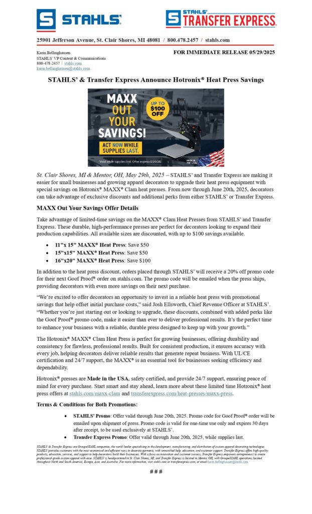 Looking to add a high-quality, USA-made heat press to your lineup without breaking the bank? Now’s your chance! For a limited time, save up to $100 on Hotronix® MAXX® Clam Heat Presses—and that’s not all. When you take advantage of this offer, you’ll also receive 20% off your next order of Goof Proof® Screen Printed Transfers from STAHLS’!